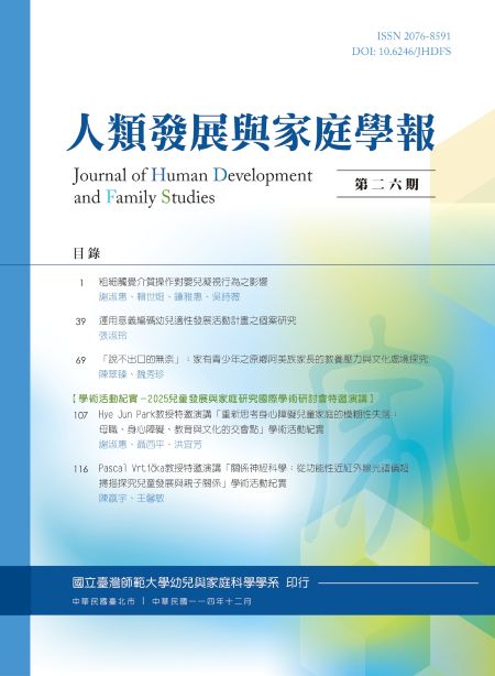 | 書籍簡介 | 「人類發展與家庭學報」為國立臺灣師範大學幼兒與家庭科學學系所發行之學術性期刊,提供國內外教師及研究人員發表未曾發表過之人類發展與家庭研究的原創性研究論文。本刊以人類發展與家庭研究為主要領域,議題包含:認知發展、語文發展、社會情緒發展、身體動作發展、大腦發展與學習、幼兒教育、教保環境與經驗、家庭資源與管理、婚姻關係、親密關係、家人關係、親職與教養、家庭型態、家庭動態歷程、家庭教育、家庭政策與服務、多元文化教育或其他相關議題,旨在提升人類發展與家庭研究的品質及促進學術與實務之交流。一年發行一期,全年徵稿。 |
